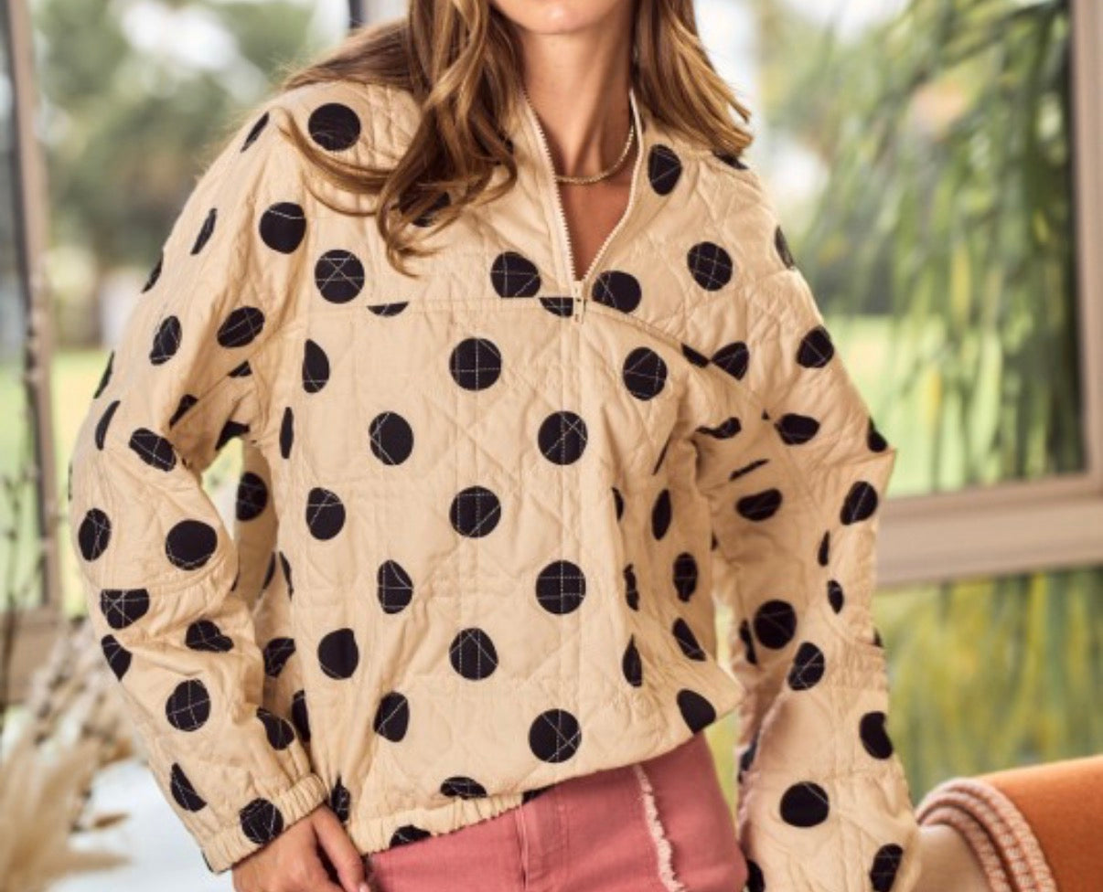 Cream + Black Polka Dot Quilted Hooded Half Zip Pullover
