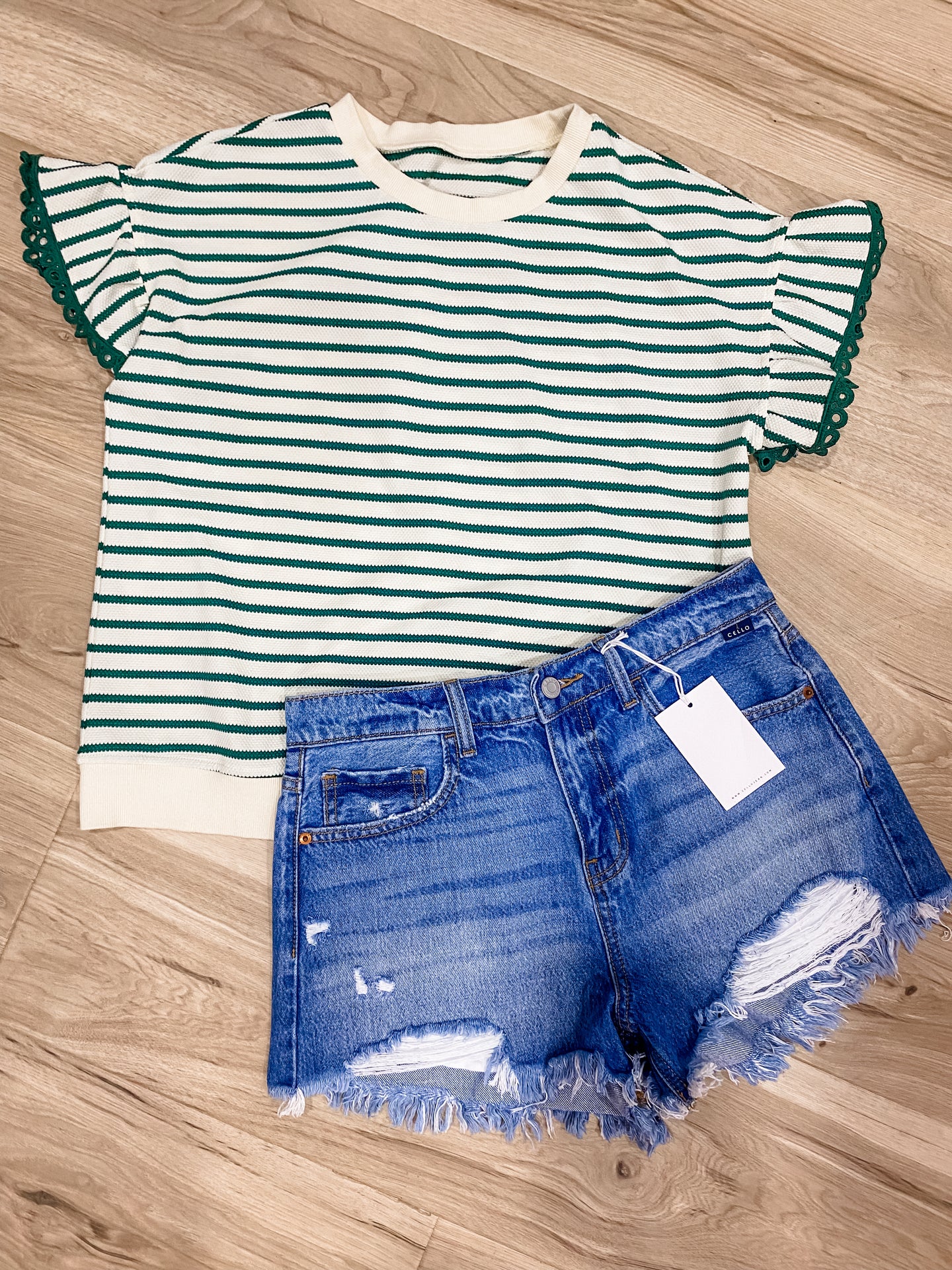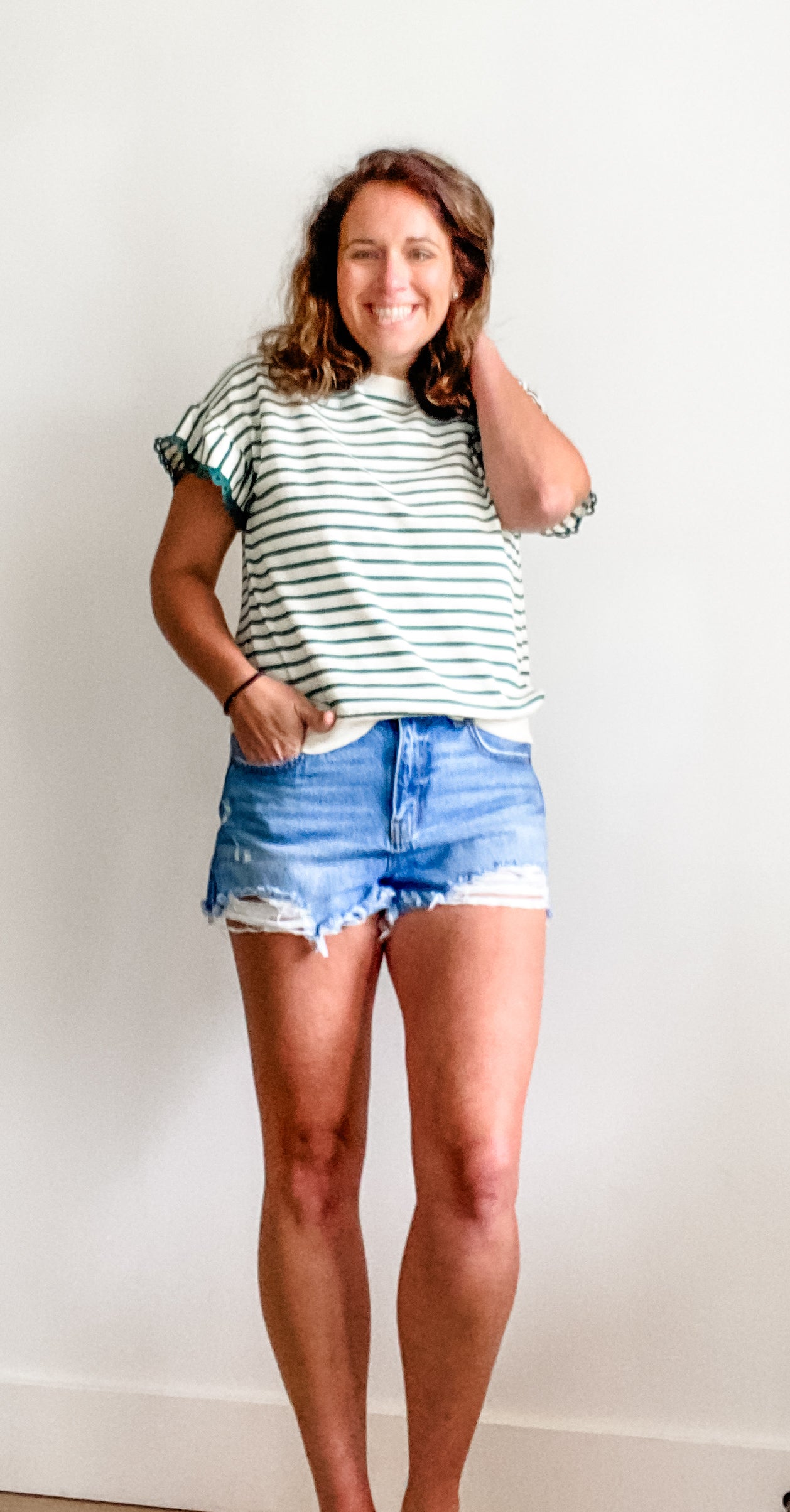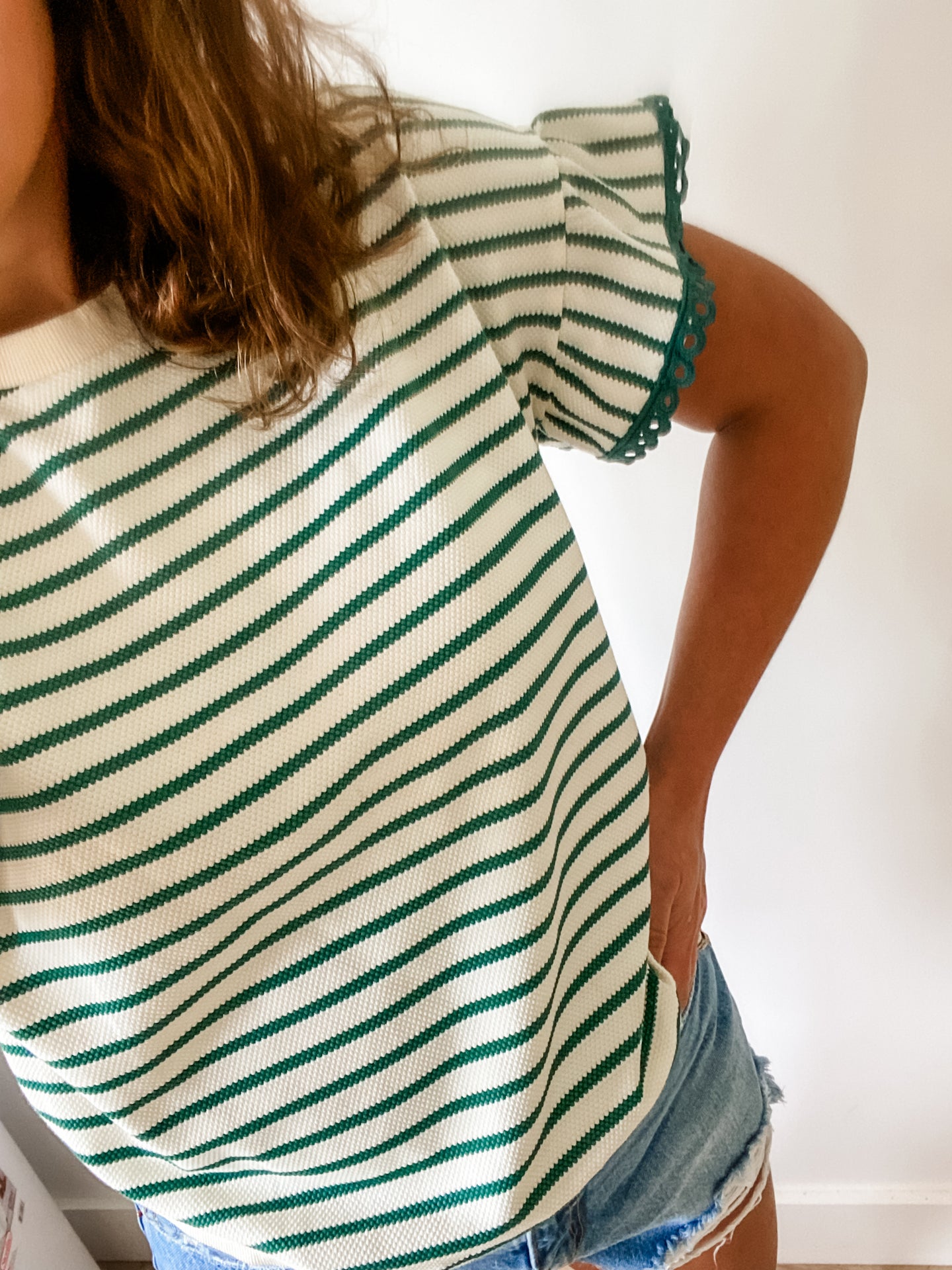Kelly Green + Oatmeal Striped Top + Flair Sleeve